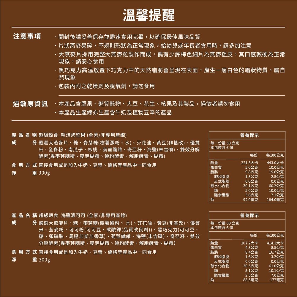 1.本產品含堅果種子類、麩質穀物及其製品,過敏者請勿食用。
