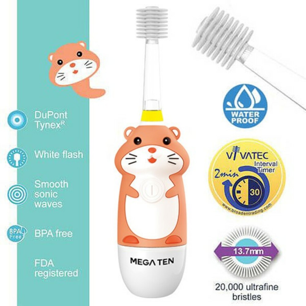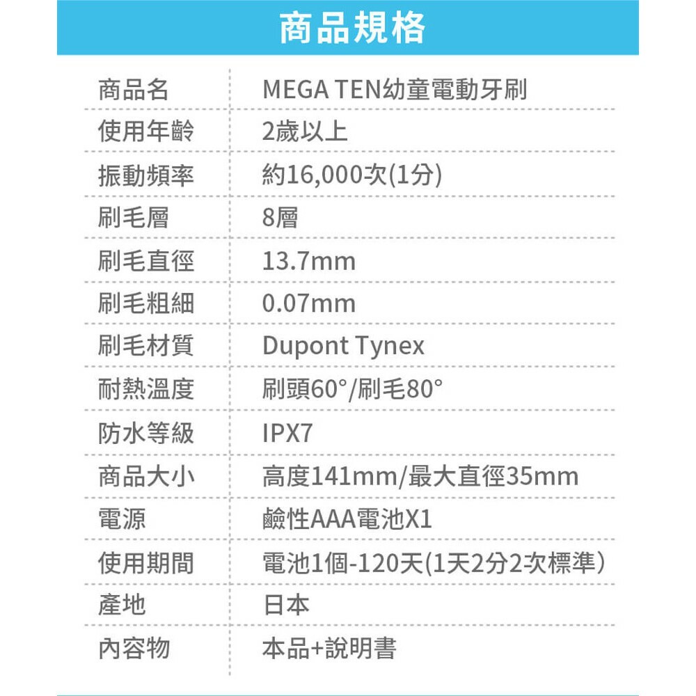 日本Vivatec 創新品牌【Mega Ten幼童電動牙刷】,日本製的刷頭,採用美國杜邦(DuPont)材質,刷毛特別加長、加多,適用年齡從2歲到8歲幼童皆可使用!2萬根細軟刷毛,每分鐘振動16000次,採溫和聲波震動,能更深入徹底清潔齒縫!